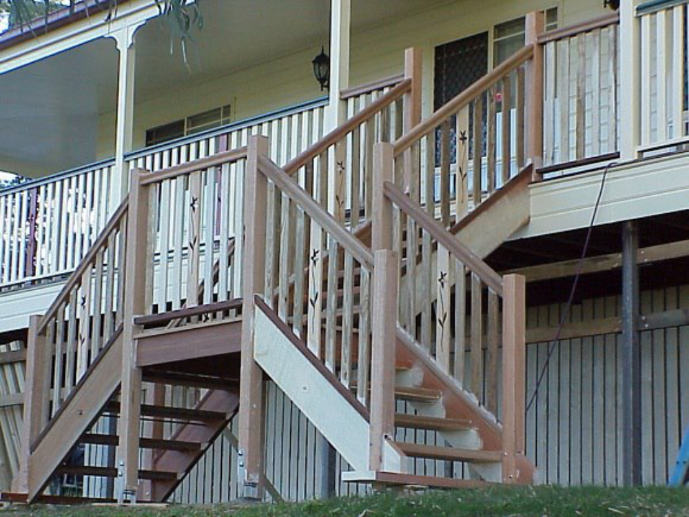 Below is a classical double staircase that is frequently found on a typical Queenslander style home. This one has a fretwork wood panel with a flower feature. (note the staircase was in the process of being installed)